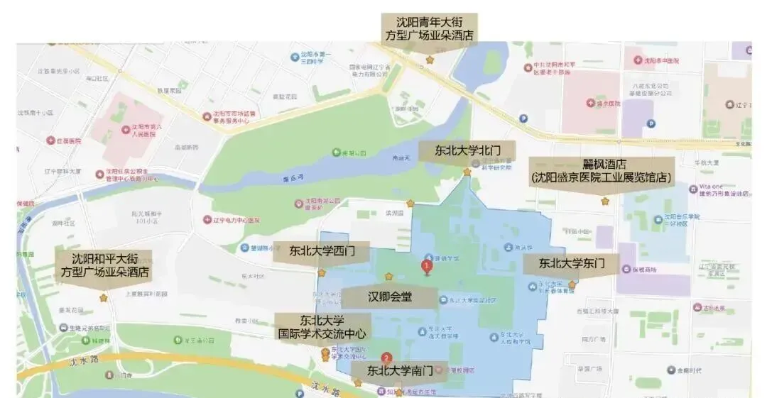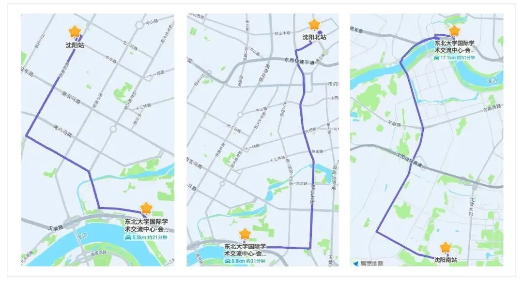 1、高铁站(沈阳站、沈阳北站、沈阳南站)—东北大学国际学术交流中心(4月24日会议报到注册地)