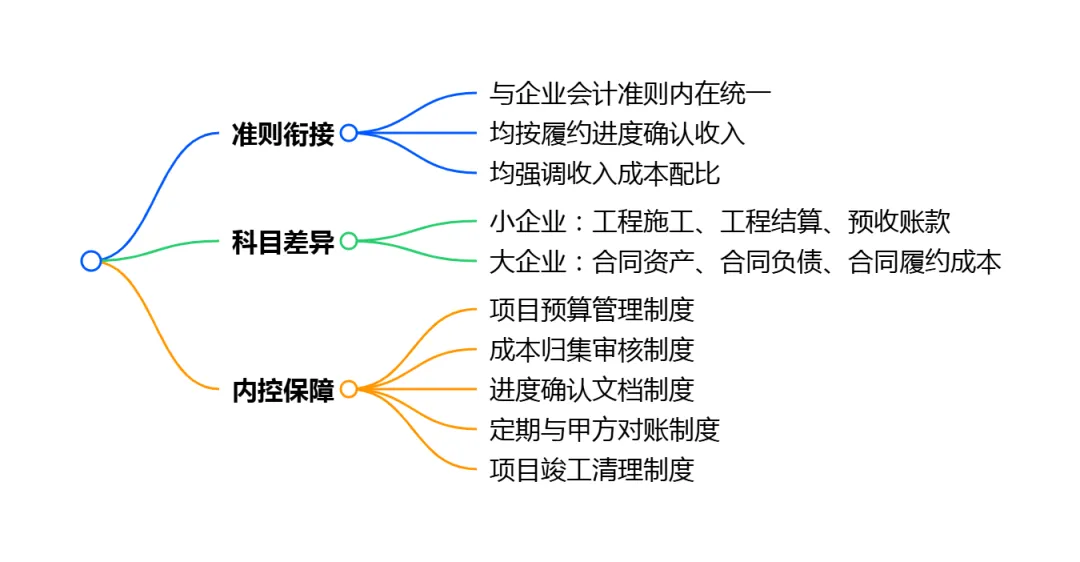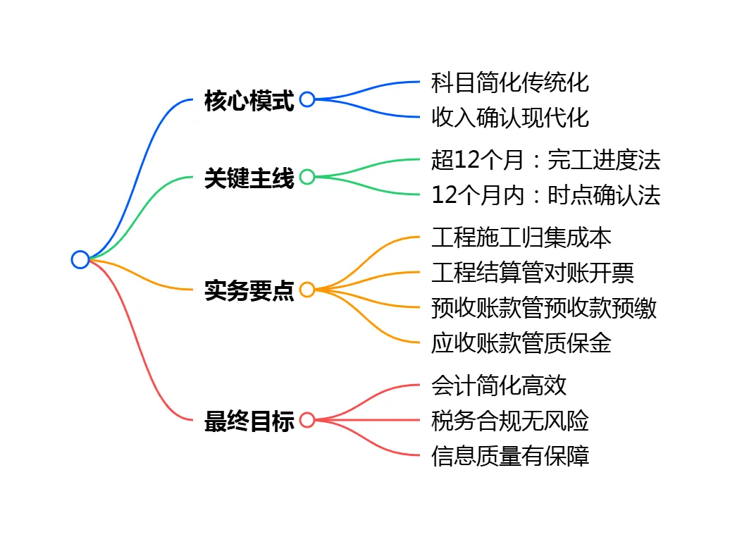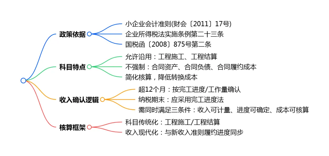 这种"科目传统化、收入现代化"的双轨制安排,构成了小企业建筑企业会计核算的基本框架:既保留了"工程施工—合同成本""工程施工—合同毛利""工程结算"等熟悉科目,又在收入确认时点上与新收入准则的履约进度模型保持同步,确保会计信息真实反映经济活动实质。
