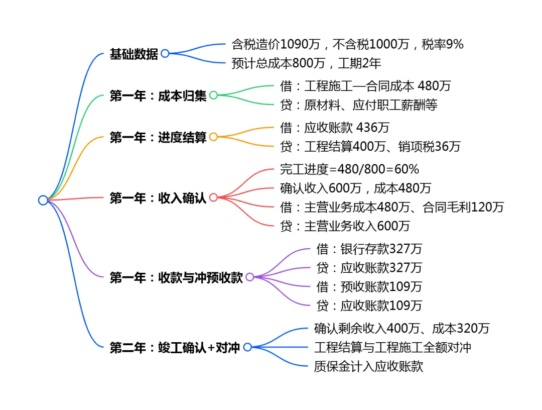 以某工程项目为例,总造价含税1090万元(不含税1000万元,税率9%),预计总成本800万元,工期两年。第一年发生实际成本480万元,与甲方办理进度结算436万元(含税),收到工程款327万元(含税),同时冲减预收款109万元。第二年发生剩余成本320万元,竣工结算剩余工程款654万元(含税,含质保金32.7万元)。