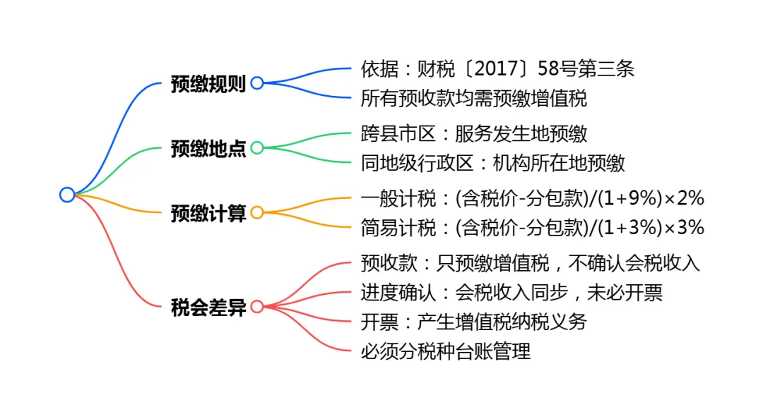 建筑服务增值税管理具有鲜明的行业特征,预缴制度的适用尤为关键。根据财税〔2017〕58号文件规定,纳税人提供建筑服务取得预收款,无论项目是否跨县(市、区),均需在收到预收款时预缴增值税。这一规定改变了此前仅对跨地区项目预缴的做法,将预缴义务扩展至所有预收款情形。
