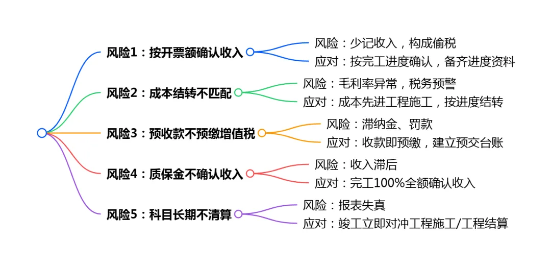 第二,成本结转不匹配的风险。收入按进度确认,但成本随意结转,导致毛利率异常波动。应对策略是严格执行"成本先进工程施工、结转自配完工进度"的流程,主营业务成本只能按完工进度从"工程施工"科目结转,分包和材料成本即使未取得发票也应暂估入账,确保成本数据的完整性。