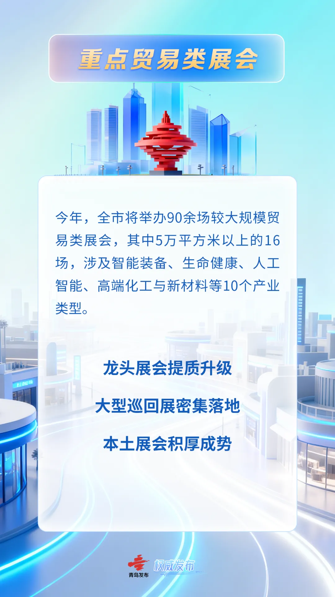 二是大型巡回展密集落地。今年全市有望引进20场以上优质巡展,总面积100万平方米。如中国国际肉类工业展览会是亚洲肉类领域规模最大、规格最高的肉类工业专业展,预计展览面积超10万平方米,为全市肉类产业提供商品采购和业界交流的全新平台。首次来青举办的全国仿真花及婚庆道具博览会是全国仿真植物花卉、婚庆道具、美陈行业的风向标,预计展览面积10万平方米,将汇聚前沿空间设计理念、一站式个性化定制方案与全链条行业资源,为青岛甜蜜经济等相关产业发展带来更多资源和机遇。同样首次来青举办的国际潜水救捞与海洋工程装备展览会,是中国潜水救捞与海洋工程领域最具影响力的品牌展会,将集中展现潜水救捞与海洋工程领域的前沿成果。