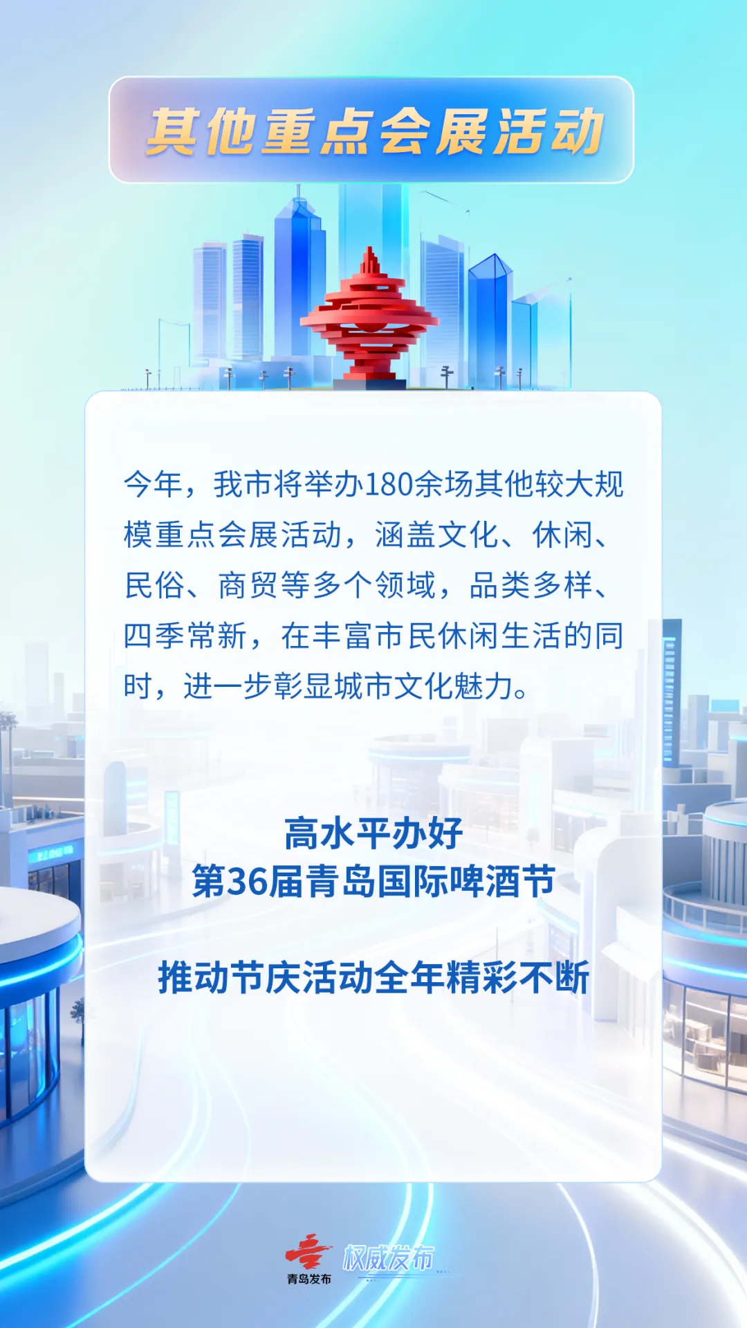 一是高水平办好第36届青岛国际啤酒节。本届啤酒节将延续“啤酒+文旅+经贸”办节模式,精心策划举办啤酒品饮、文艺演出等一系列精彩活动,持续优化服务保障,打造消费新场景,进一步增强国际范、体验感、文化味,不断放大节庆效应,擦亮青岛啤酒文化品牌。