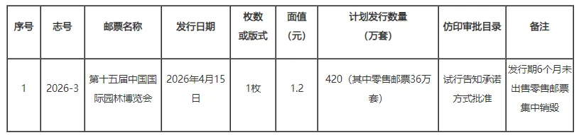 经国家邮政局审定,《第十五届中国国际园林博览会》纪念邮票计划发行数量、仿印审批目录情况如下: