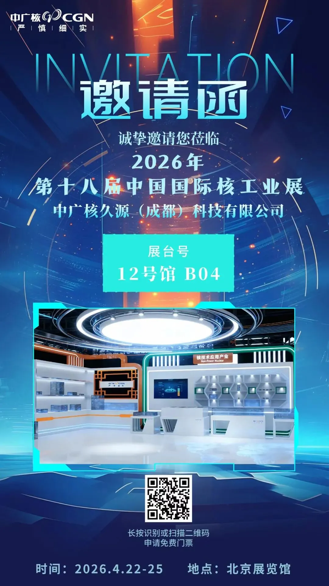 扫描邀请函下方二维码,即可免费报名。4月22-25日,中广核久源在北京展览馆(12号馆B04展位)翘首以盼,期待与您相会。