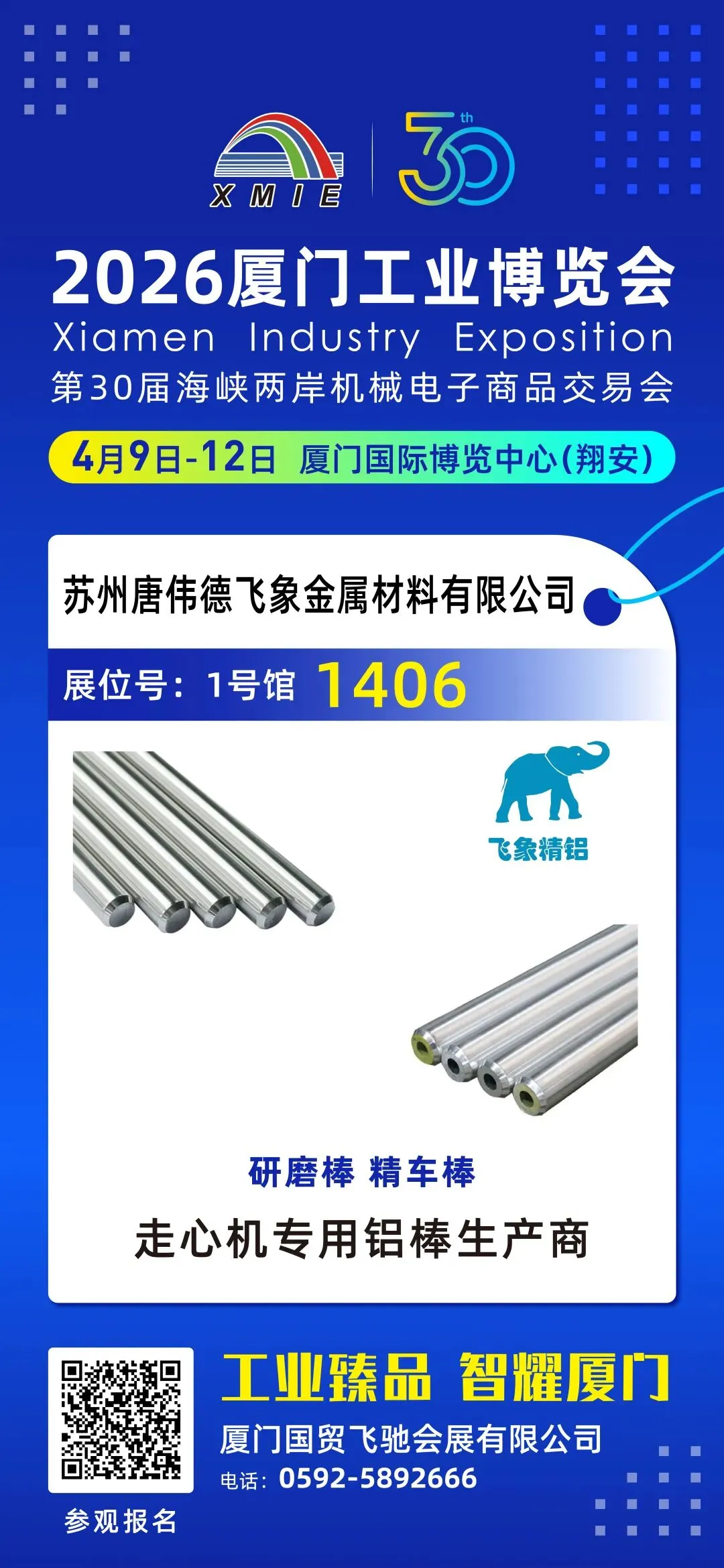 2026年4月9日-12日,第30届海峡两岸机械电子商品交易会暨2026厦门工业博览会(XMIE)将在厦门国际博览中心(翔安)盛大启幕。作为走心机专用铝棒领域的专业生产商,苏州唐伟德飞象金属材料有限公司将携旗下明星产品——研磨棒、精车棒及走心机专用铝棒,重磅亮相1号馆1406展位,与全球工业同仁共襄盛会,共话智能制造新机遇!