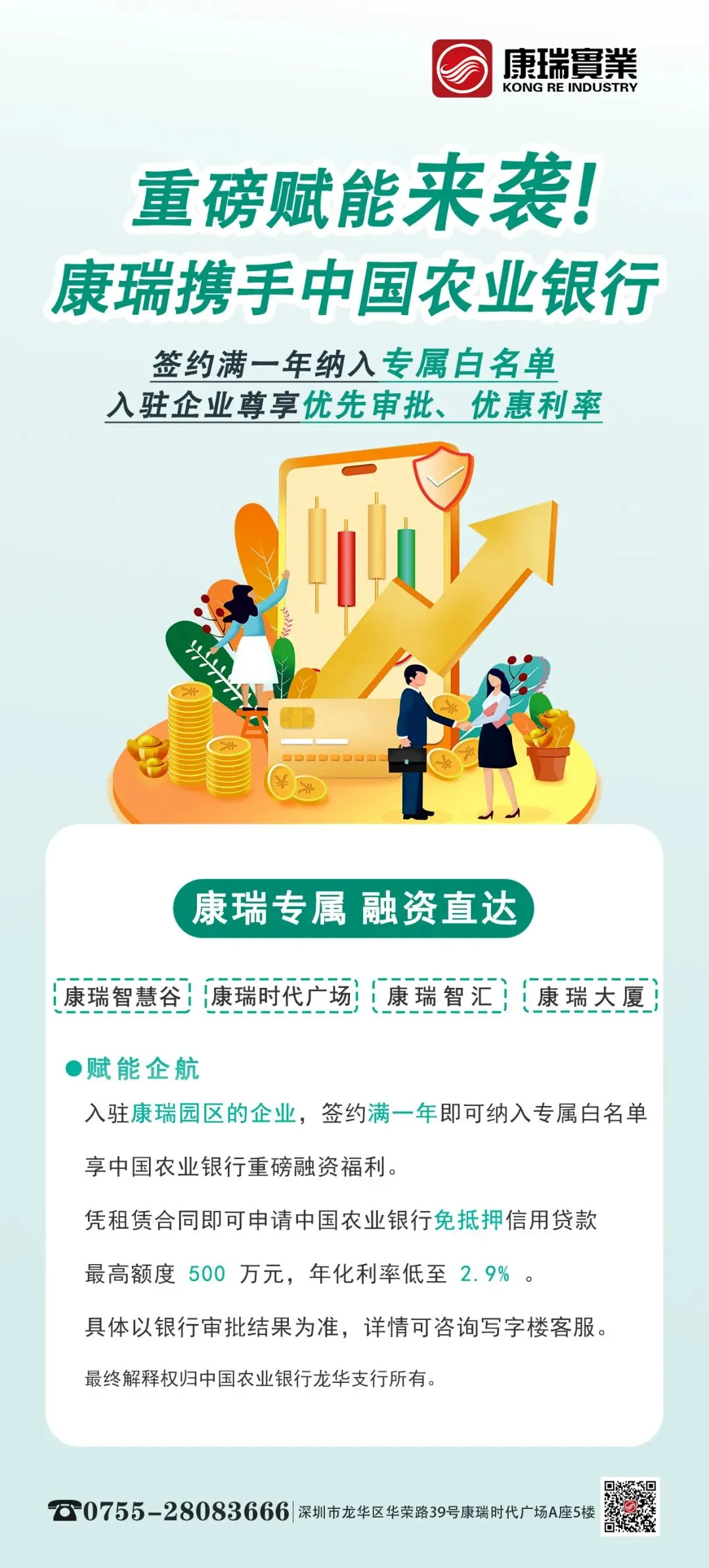 康瑞重磅赋能来袭!入驻康瑞园区的企业,签约满一年即可纳入专属白名单,享中国农业银行重磅融资福利,最高额度 500 万元 ~