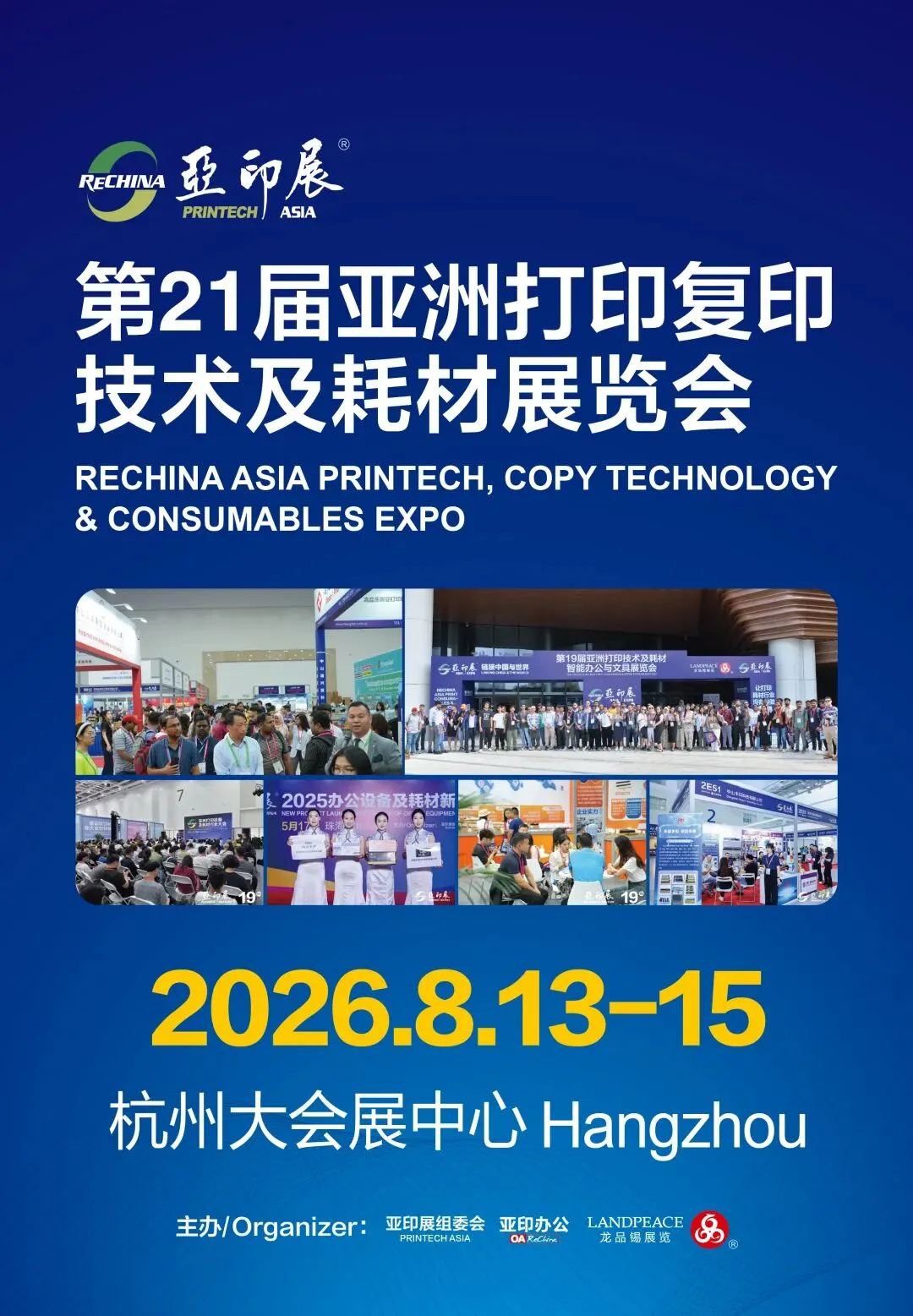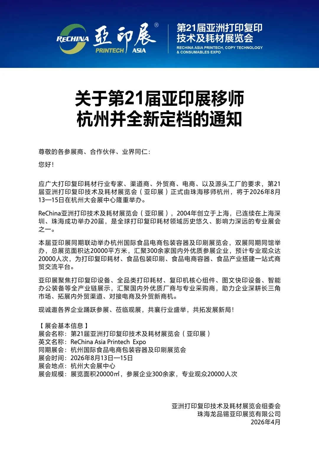 应广大打印复印耗材行业专家、渠道商、外贸商、电商、以及源头工厂的要求,第21届亚洲打印复印技术及耗材展览会(亚印展)正式由珠海移师杭州,将于2026年8月13日-15日在杭州大会展中心隆重举办。