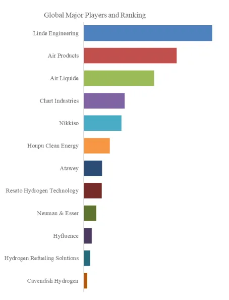 Linde Engineering、 Air Products、 Air Liquide、 Chart Industries、 Nikkiso、 厚普股份、 Atawey、 Resato Hydrogen Technology、 Neuman & Esser、 Hyfluence、 Hydrogen Refueling Solutions、 Cavendish Hydrogen
