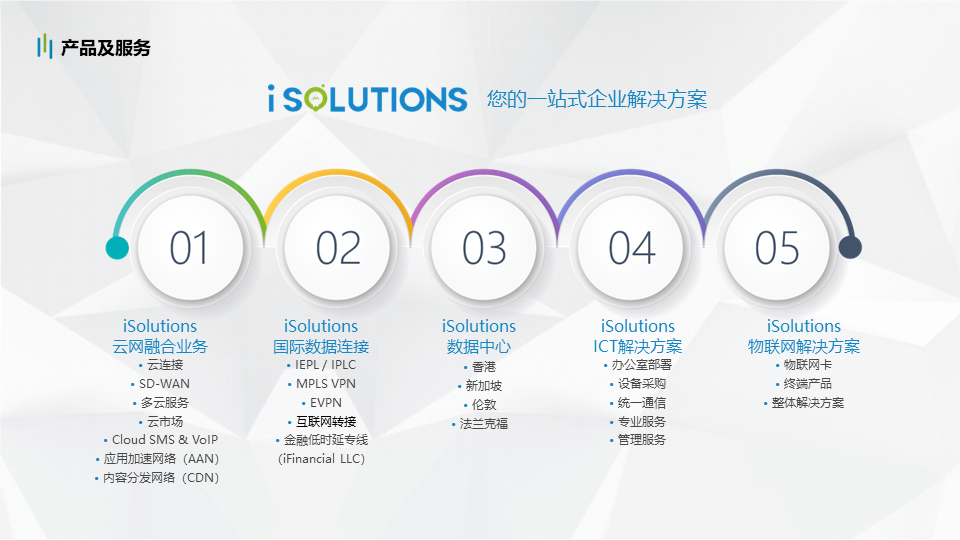 针对进出口企业跨境连接、跨境云服务等需求,中国移动提供更丰富的海外信息化服务,包括跨境专线、SDWAN、海外ICT解决方案、海外数据中心等产品,为海外贸易企业在全球办公、全球生产、全球运营等需求提供一站式跨境解决方案。