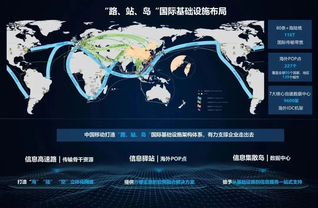 中国移动在全球拥有丰富的网络资源、庞大的客户群体,是市场价值领先的电信运营商,通过打造信息高速路-传输骨干资源、信息驿站-海外POP资源、信息集散岛-数据中心基础设施架构体系,实现行业领先,成功建立全球通达精品国际基础网络。