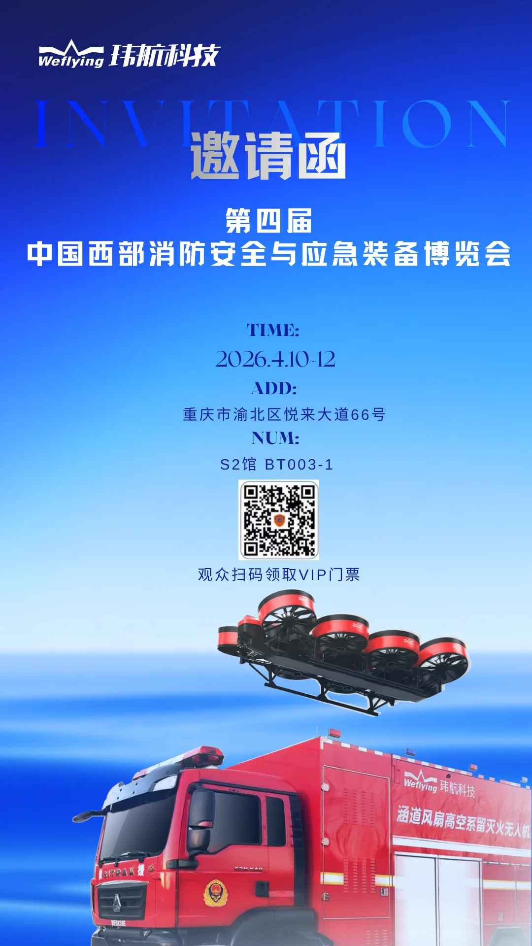 由重庆消防协会主办,北京汉森国际展览有限公司、成都市公羊会公益服务中心联合主办的第四届中国西部消防安全与应急装备博览会将于2026年4月10-12日在重庆国际博览中心举行,玮航科技携涵道风扇高空系留主战灭火无人机系统——敖钦参展,诚邀您拨冗莅临,共话行业发展!