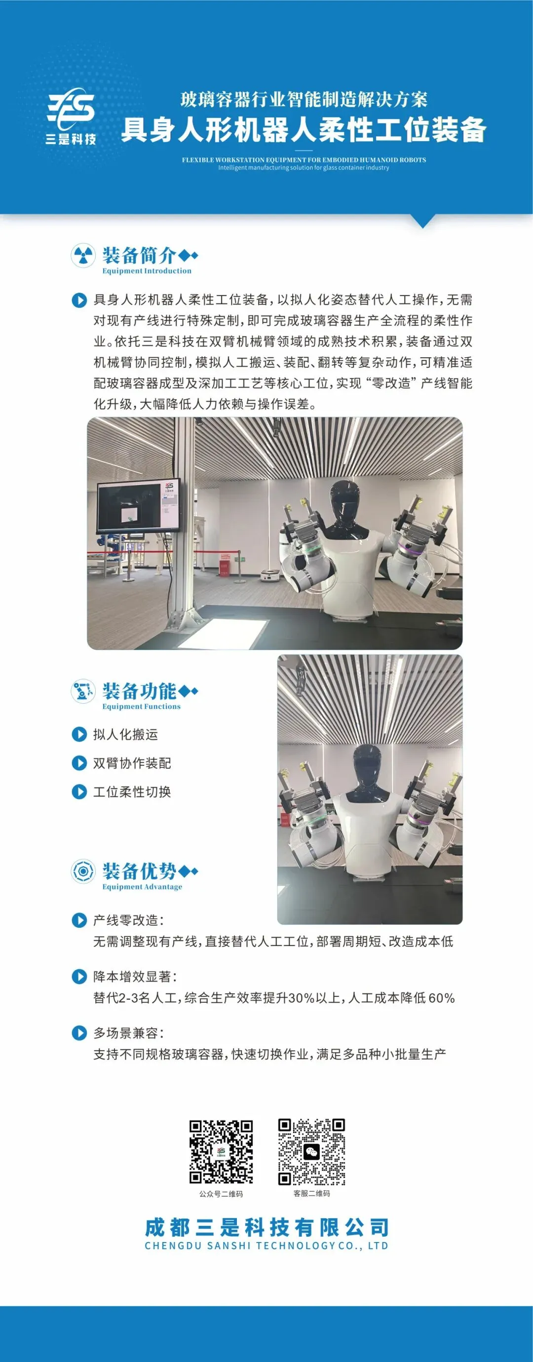 本次展会,三是科技重点展出的具身人形机器人柔性工位装备,以拟人化姿态打破传统生产模式,成为现场最受关注的核心展品之一。该装备无需对现有产线进行特殊定制,即可无缝融入玻璃容器生产全流程,完成柔性作业,为玻璃企业提供高效、便捷的智能化升级解决方案。