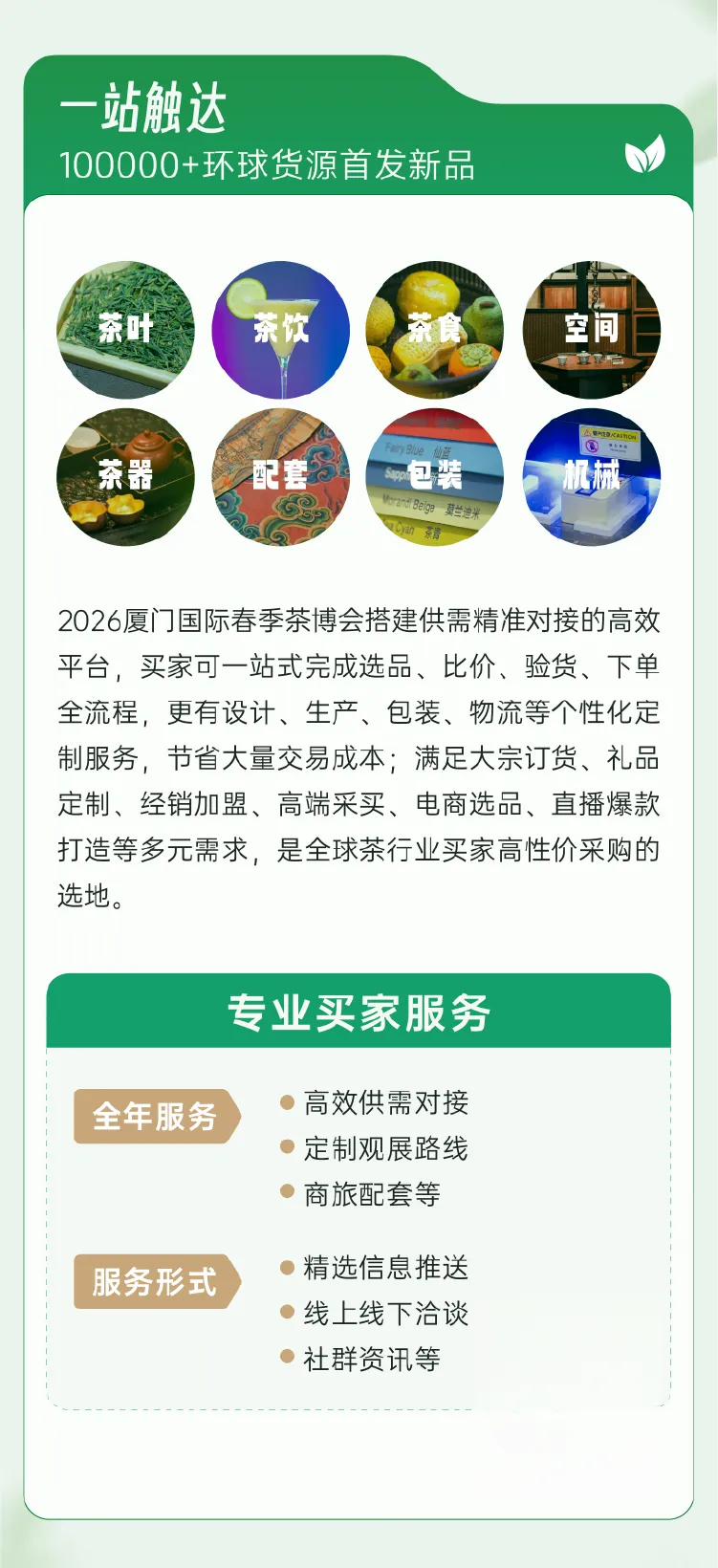 春茶吐绿,香飘鹭岛。2026中国厦门国际茶产业(春季)博览会期间,A1馆将同期举办2026绿茶采购交易会。本届交易将整合不同地域标志性的优质源头产区资源,精准对接深加工采购需求与绿茶贸易供给,助力延伸绿茶产业链。
