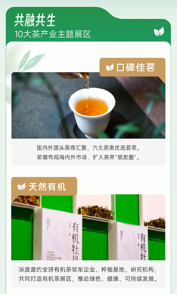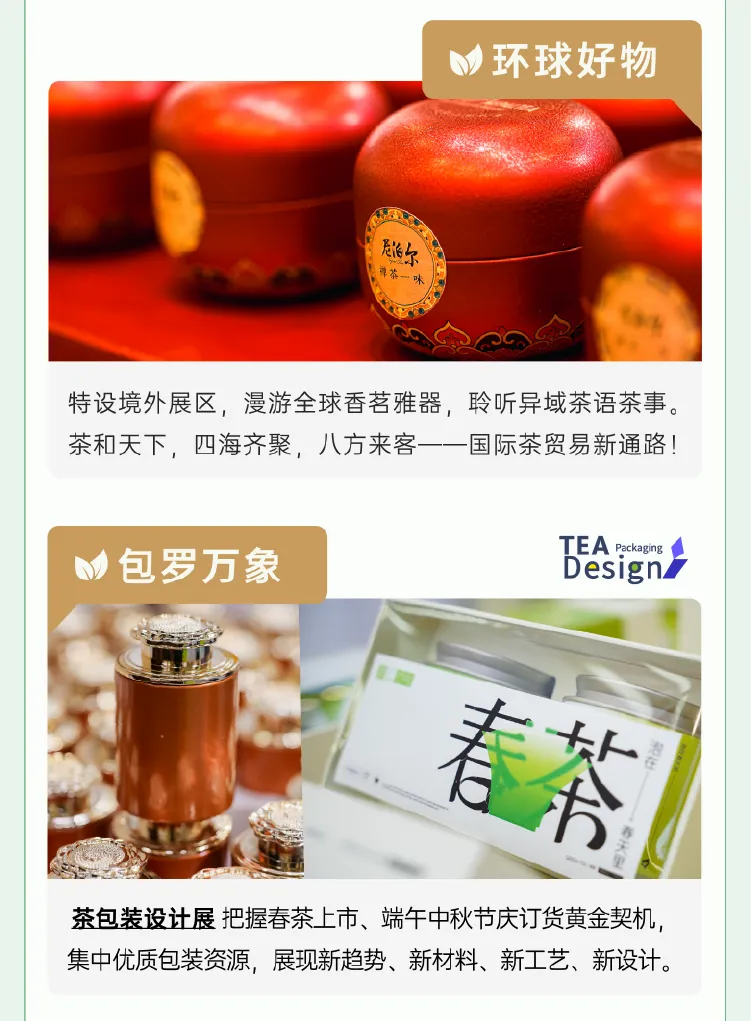 本届展会以63,000㎡展览矩阵、1,000+环球优质展商、100,000+年度精选新品、200,000+专业采购观众的强大势能,精准对接经销商、代理商、贸易商、酒店和餐饮服务商、食品加工商、大型连锁商超、社交电商等全渠道资源,加速全球茶产业链、供应链、价值链深度协作与价值共创。