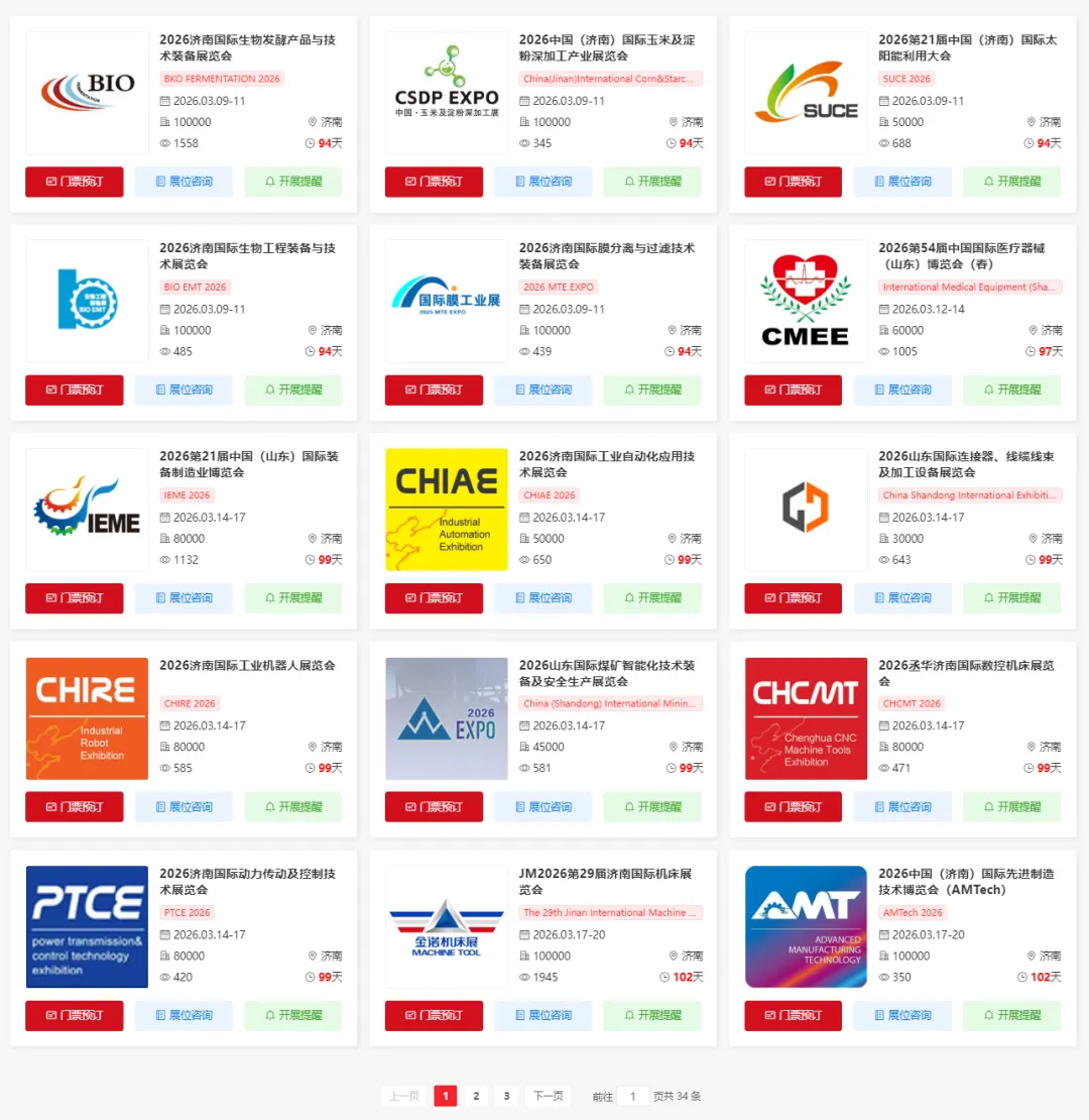 2026年济南将举办多场重要的展会活动,涵盖了生物、生物发酵、工业、太阳能光伏、医疗器械、工业、煤炭、工业自动化、电线电缆、机床、机器人、动力传动、机床、智能制造、美容、化工、电动车、家用装饰等多个领域。小编为大家整理了2026济南全年展会排期表,希望能帮助你规划行程。末文获取济南展会门票预约入口~(大多门票限时免费)
