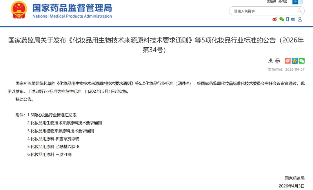 国家药监局关于发布《化妆品用生物技术来源原料技术要求通则》等5项化妆品行业标准的公告(2026年第34号)