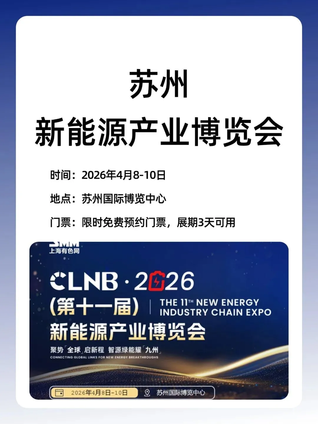 CLNB 2026(第十一届)新能源产业博览会定于2026年4月8日-10日在苏州国际博览中心隆重举办。1500+行业龙头集结、30000+专业观众齐聚、5大核心展区联动、11+场高端论坛同步开启,一站式解锁新能源产业前沿技术、商机与合作机遇。