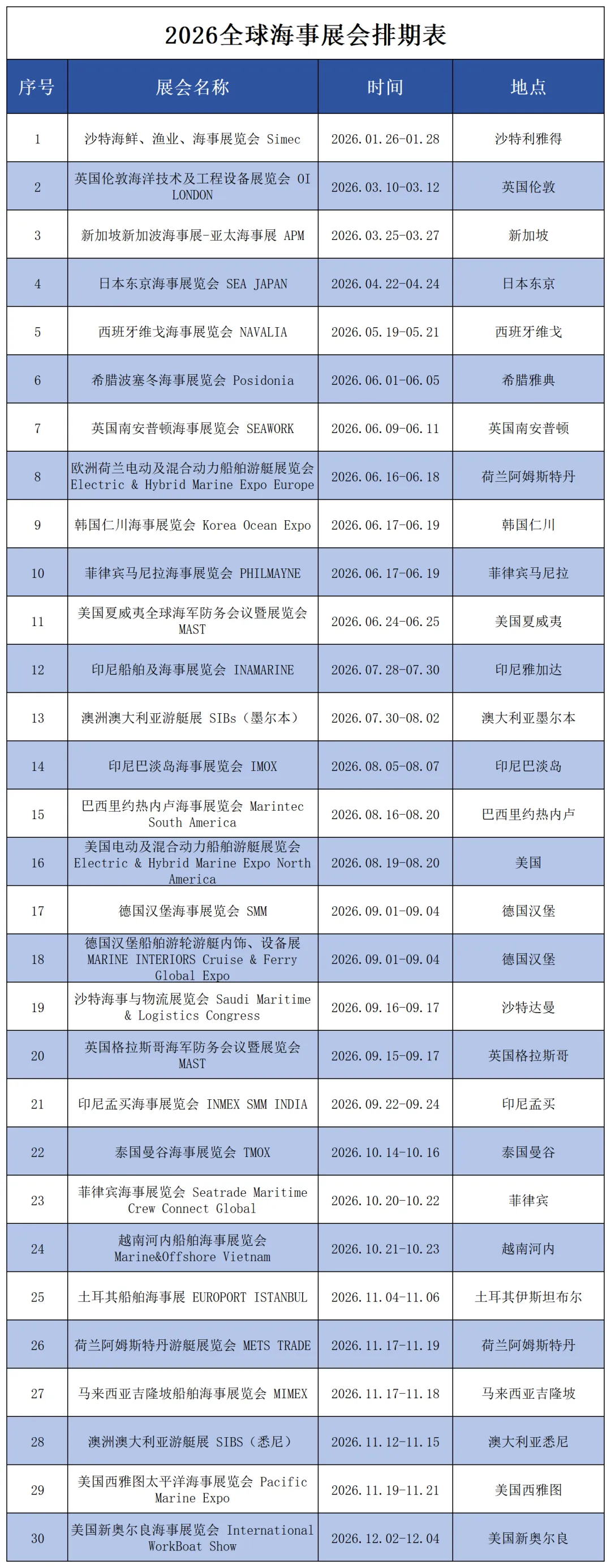这份排期表不仅是一份时间与地点的清单,更是您开拓全球市场、获取前沿资讯、对接百万级专业买家、发布核心技术的年度商务地图。无论您是船东、船厂、设备供应商、物流商还是技术服务商,都能从中找到匹配自身业务、拓展全球商机的最佳舞台。