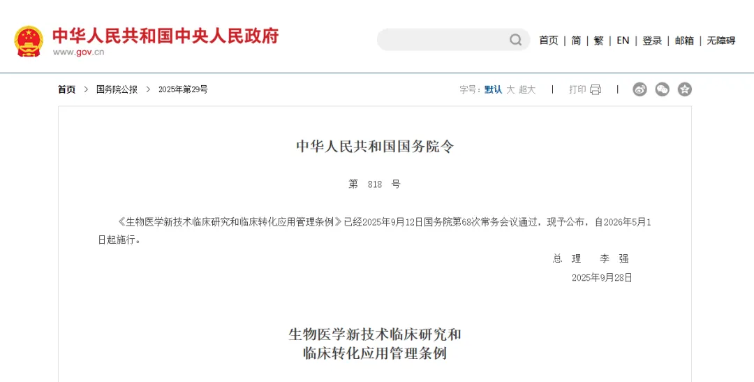 2026年5月1日,国务院颁布的《生物医学新技术临床研究和临床转化应用管理条例》(818号令)将正式实施。