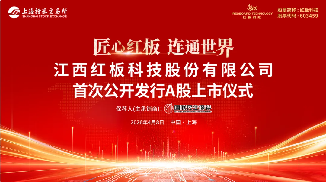 4月8日,江西红板科技股份有限公司(简称“红板科技”或“公司”)正式在上交所鸣锣开市,荣耀登陆资本市场,股票代码为“603459”。