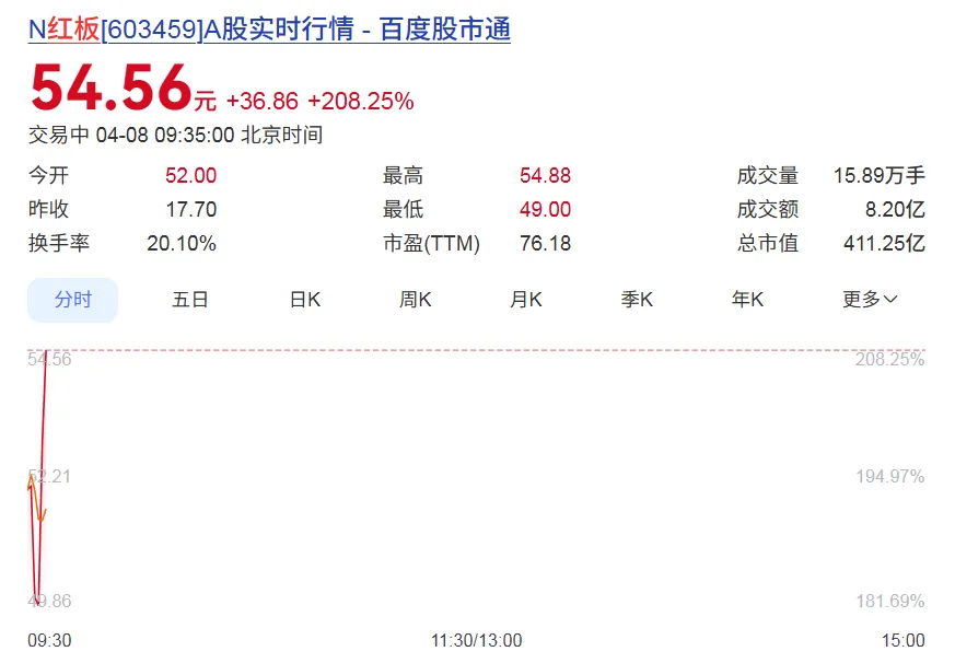 红板科技开盘股价高开52元,涨幅193.79%,截至9:35,股价为54.56元,涨幅208.25%。