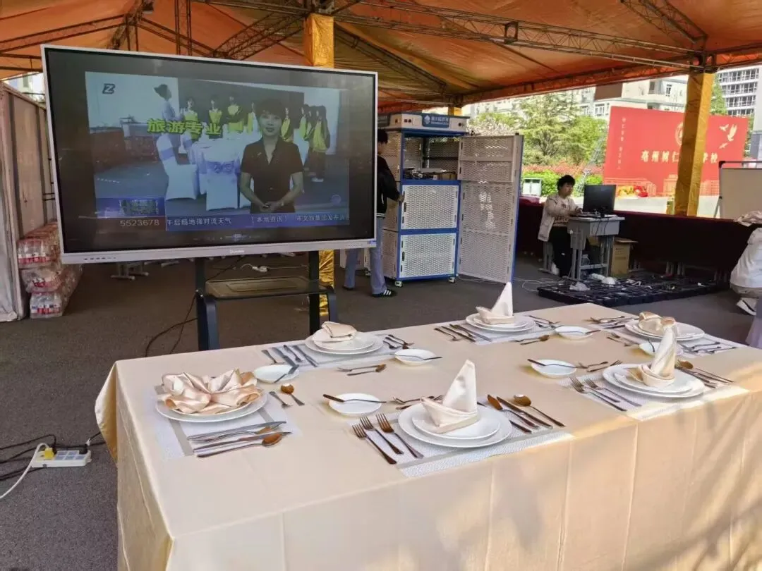 电子商务专业展区里,学生们通过直播带货、电商平台运营等方式,展示着他们在电商领域的创新能力。旅游服务与管理专业展区则充满了专业与雅致的氛围。规范标准的中西餐摆台、精致的餐巾折花造型,搭配专业技能展示视频,全面呈现了学生在酒店服务、礼仪规范等方面的扎实功底,展现了旅游专业学子的职业素养与服务能力。