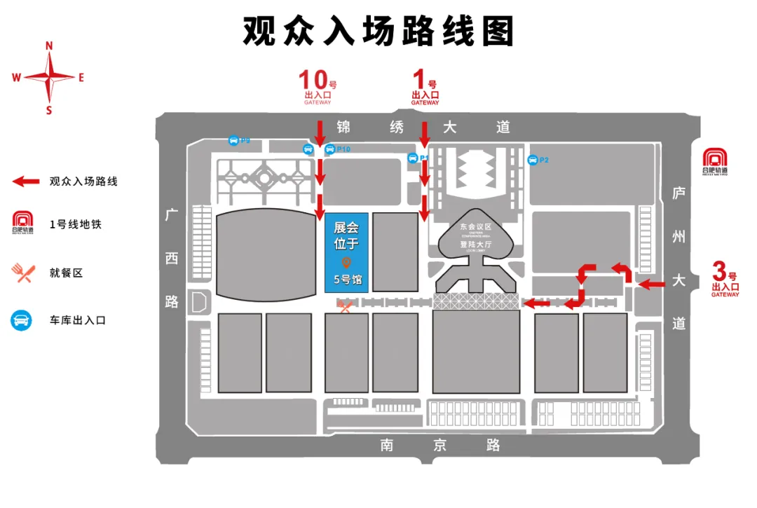 1. 观众请由上图所示锦绣大道10号、1号道口,庐州大道3号道口进出参观。