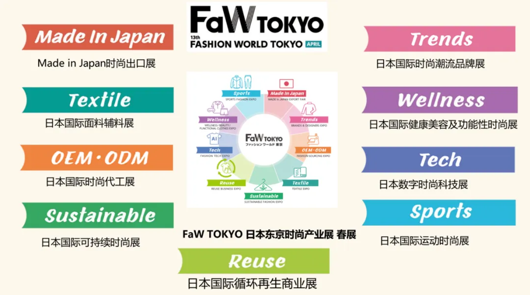 FaW TOKYO由多个专业展区组成,涵盖时尚全产业链,包括品牌、面料、健康与运动、可持续时尚、日本制造工艺、采购解决方案、眼镜以及时尚科技。为全球时尚从业者、采购商及专业人士打造一站式采购与交流平台。