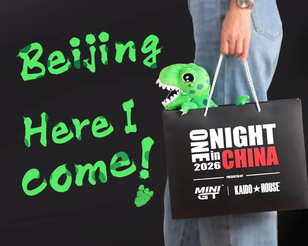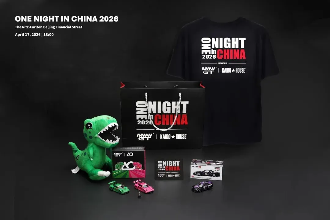 所有内容均装入专为 2026 中国模型展打造的 MINI GT × AO Racing 主题纸袋中。※ 展会期间可于 MINI GT 展位购买准备好见到 REXY 了吗?Rawwwwwr!?⸻ONE NIGHT IN CHINA 2026MINI GT 的 “One Night” 活动已成为车模玩家圈中的经典传统盛会,是与收藏者及社区共同分享热爱、交流未来计划的重要时刻。在 One Night in China 2026,官方为晚宴嘉宾准备了专属限定礼品:AO Racing IMSA 2024 GTD Pro 冠军套装全球限量 5000 套产品编号:MGTS0024包含:• Rexy 展示车(附奖杯)• Roxy 展示车• Rexy 毛绒玩偶Nissan Skyline GT-R (R34) Kaido Works2026 中国模型展限定产品编号:KHMG271• One Night in China 活动纪念 T 恤• One Night in China 纪念贴纸
