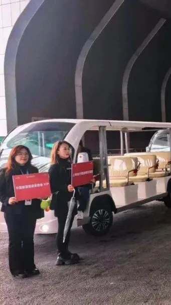 工作人员站在电动接驳车旁,随时准备为嘉宾提供接送服务。