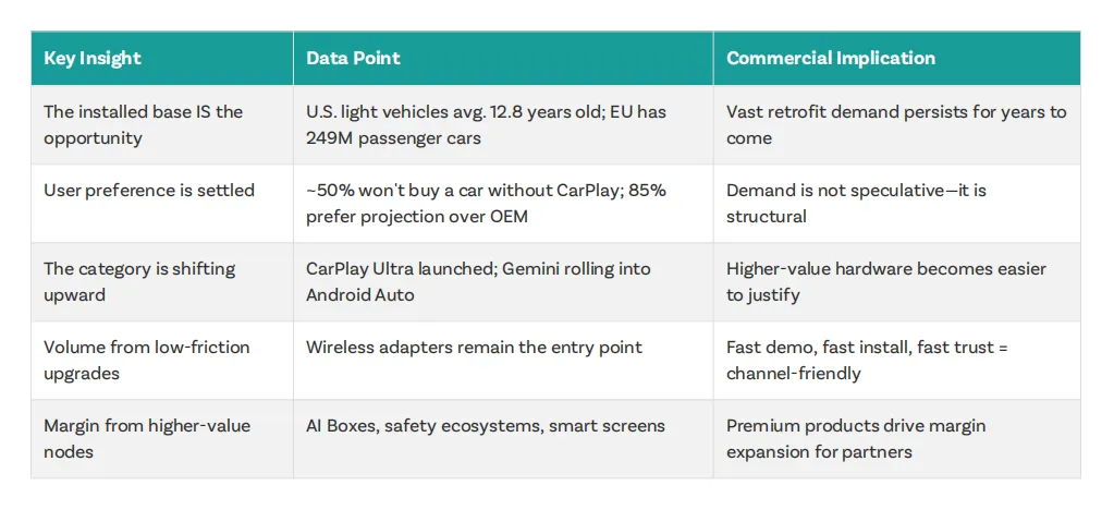 低退货率、低售后成本、易安装、高稳定,并与 CarPlay 生态高度同频。