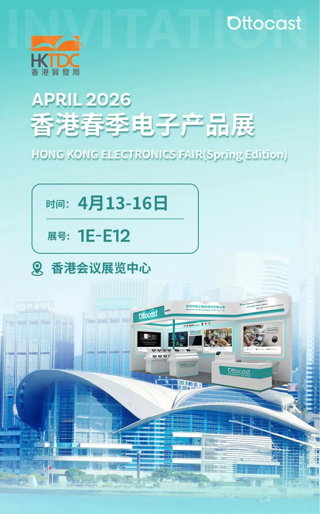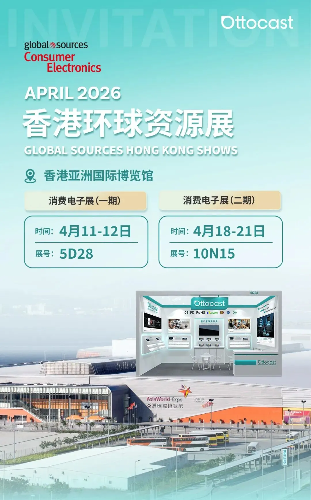 2026年4月,面对面交流商机、共拓全球市场!Ottocast 将携核心产品重磅参展,连续亮相香港环球资源消费电子展览会(一期+二期)与香港春季电子展,每一场展会均有专属布局与重点呈现,诚邀各大车企、渠道商、电商卖家、方案集成商莅临现场,面对面交流商机、共拓全球市场!