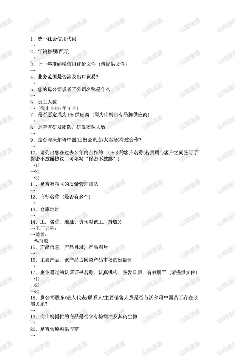 山姆不是问你有没有品控,而是问品控有没有独立于生产部门。独立的质量管理团队,意味着品控不会被产能压力妥协,意味着出了问题有人专门负责,而不是所有人都在推卸责任。山姆的标准在升级,消费者的需求在变化,一个没有研发团队的供应商,本质上是在吃老本。采购心里很清楚,没有研发能力的供应商,留下来的时间是有限的。你报上去的客户名称,山姆可能会去核实合作情况、规模大小、你的履约质量。如果有保密协议可以不填,但如果你填了,就要做好被核查的准备。你的TOP3客户是谁,说明你的产品在什么量级的市场里被认可。服务过头部客户的供应商,和只服务过中小客户的供应商,采购对你们的判断是不一样的。第五层:两个容易被忽视的问题