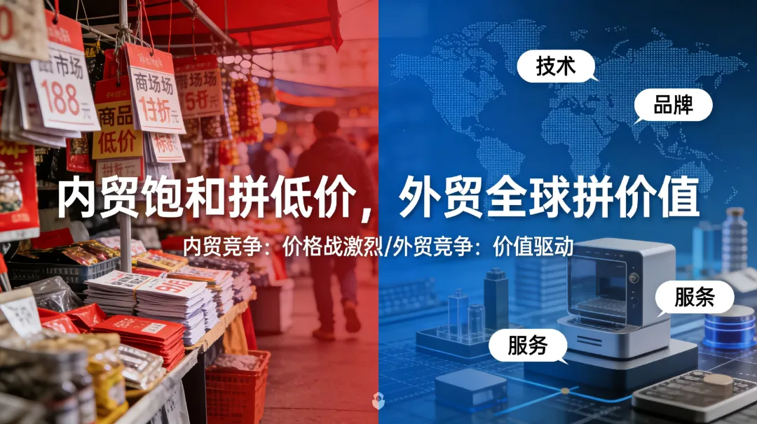竞争维度也彻底改变:内贸是单一的价格战,谁价低谁赢;外贸则是多维度的价值竞争 —— 产品质量、创新卖点、高新技术、绿色环保、智能科技、配套服务…… 都是核心竞争力。