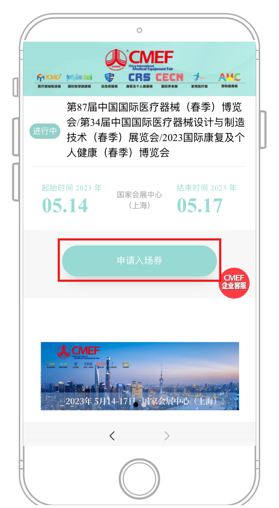 扫描预登记二维码或关注CMEF官微点击[获取门票]后点击[申请入场券]