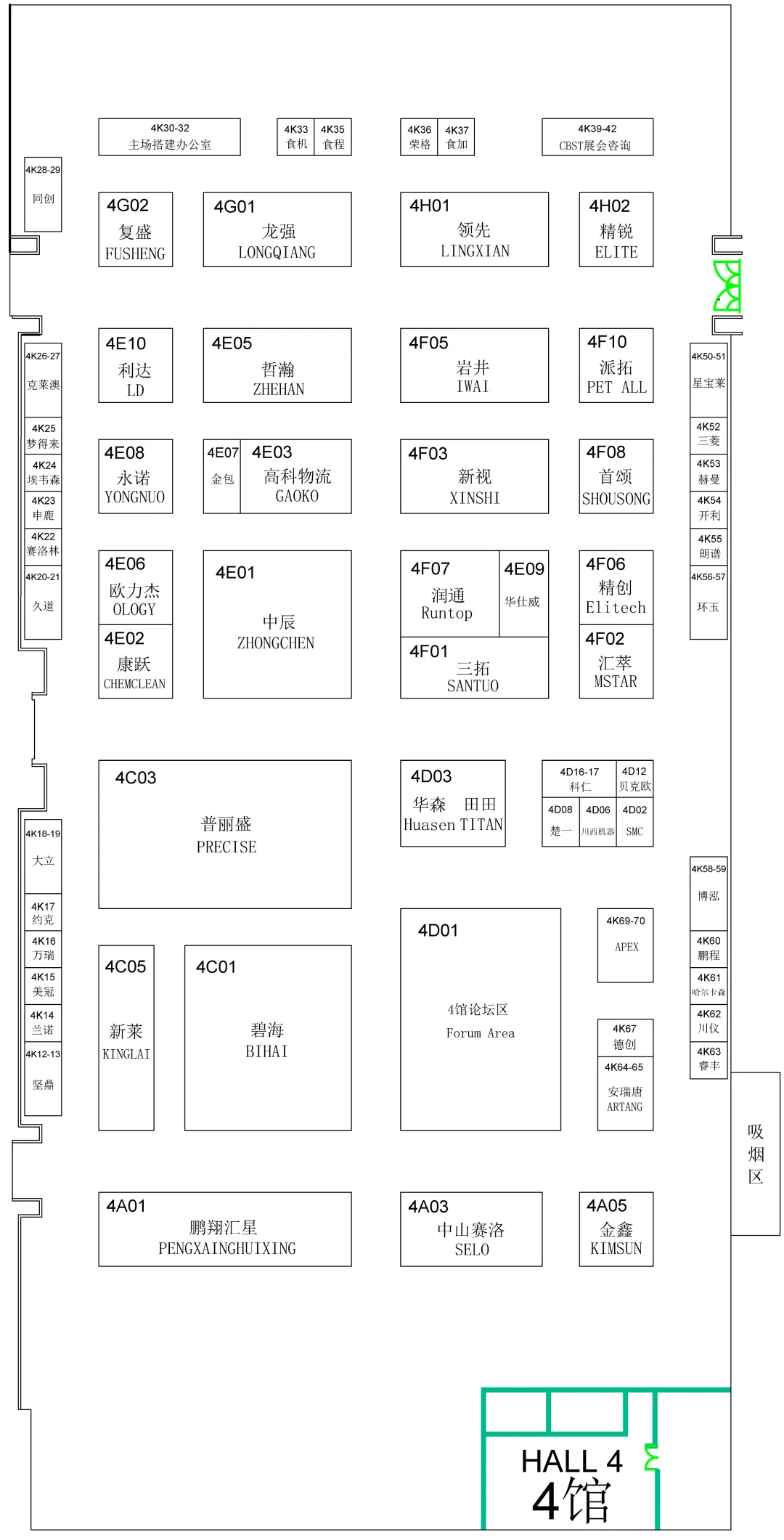 KRONES(克朗斯 2D01)、KHS(科埃斯 2A05)、SIG(康美包 2E032)、Sidel(西得乐 2C03)、GEA(基伊埃 2G01)、SIEMENS(西门子 2G05)、Omnia(欧姆尼亚 2A07);