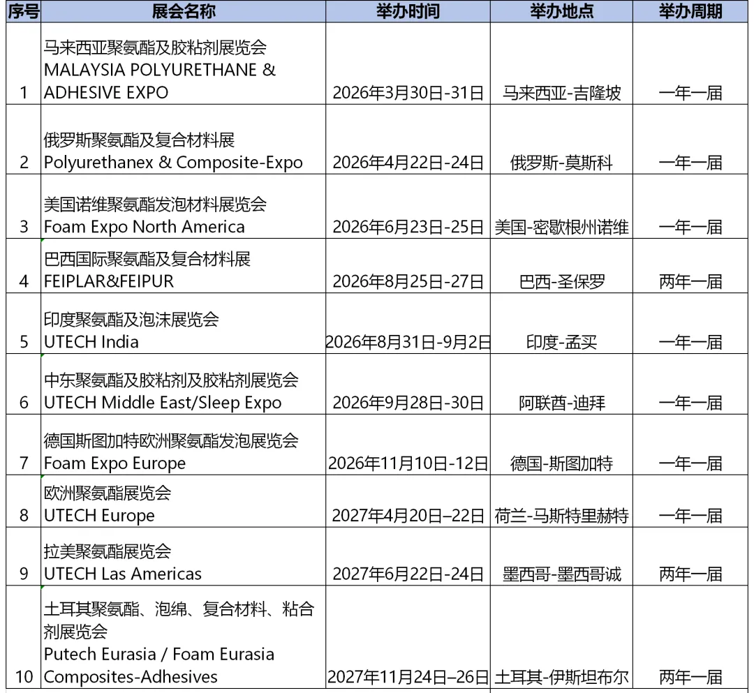 2026年全球热门聚氨酯展会一览表