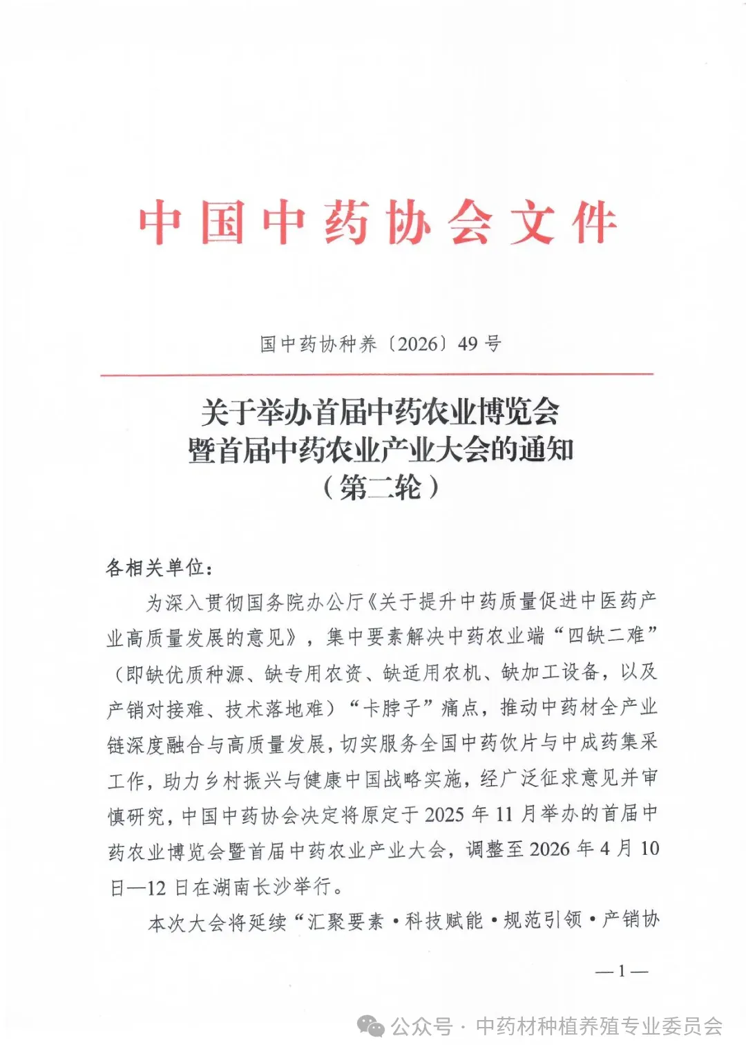 为深入贯彻国务院办公厅《关于提升中药质量促进中医药产业高质量发展的意见》,集中要素解决中药农业端"四缺二难"卡脖子痛点,推动中药材基地与工业企业直接对接与品牌化发展,切实服务全国中药饮片与中成药集采工作,助力乡村振兴与健康中国战略实施,经广泛征求意见并审慎研究,中国中药协会决定将首届中药农业博览会暨首届中药农业产业大会定于2026年4月10日-12日在湖南长沙举行。