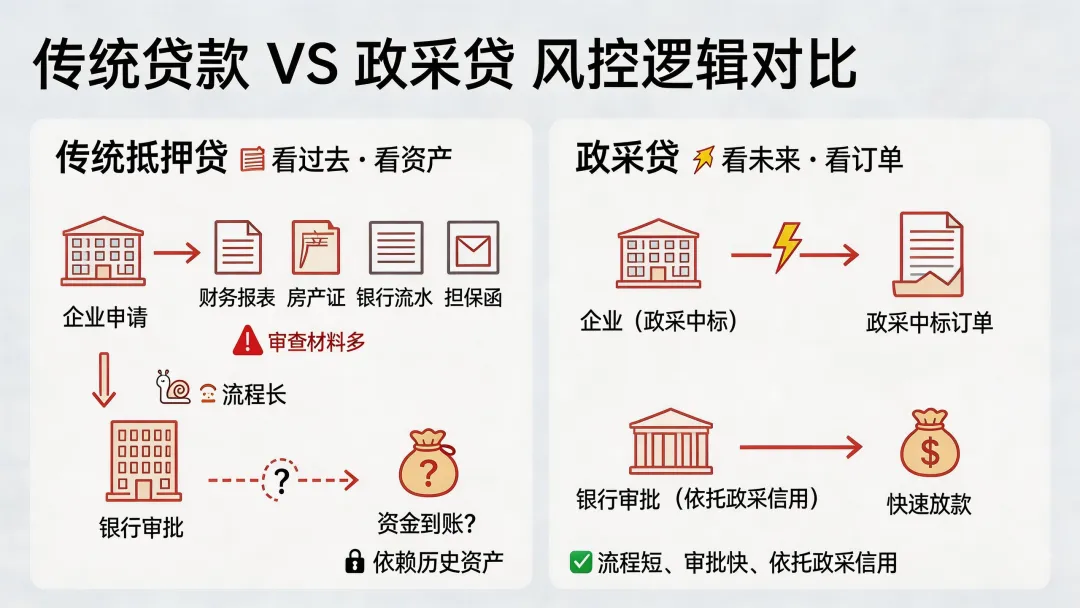 这种普遍困境,正催生一种更精准的金融解决方案的普及:政采贷(政府采购合同融资)。与聚焦企业历史资产的传统思路不同,政采贷的逻辑是向前看的。它更像一个“项目启动器”,其风控核心在于审核三个确定性:合同是否真实有效?付款方(政府/国企)信用是否可靠?企业是否具备履约能力?一旦确认,融资的匹配效率与成本优势便随之凸显。