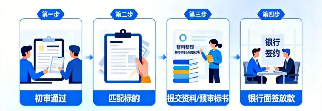 初审通过→ 匹配到标→提交资料→竞标辅导→入会中标→提交银行申请→当地银行放款面签→支付佣金