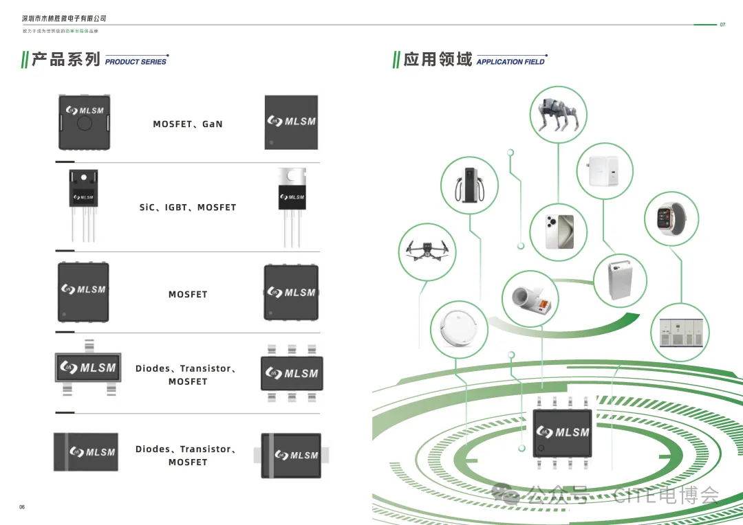 公司成立以来专注于MOSFET、SiC、GaN等半导体芯片和功率器件的研发、设计及销售。产品线涵盖MOSFET、IGBT、Transistor、Diodes等,产品优质且系列齐全,广泛应用于消费电子、汽车电子、绿色照明、安防工控、网络通讯、智能终端、新能源等领域;未来随着云计算、大数据、智能电网、机器人等领域的蓬勃发展,公司产品将在该新兴领域发挥重要作用。
