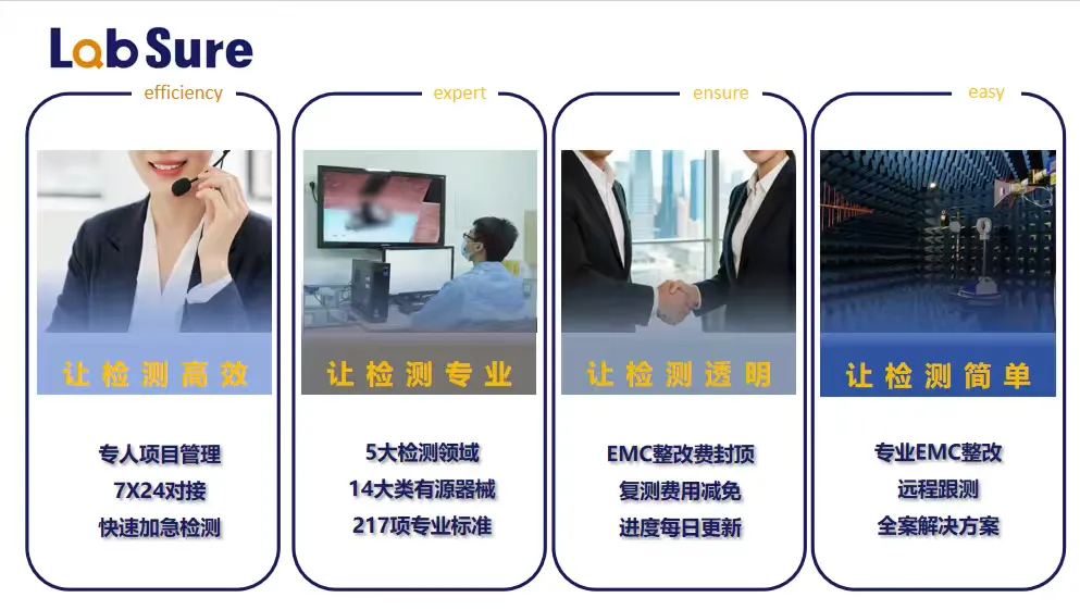在专业度上,LabSure深耕5大检测领域,覆盖14大类有源器械,遵循217项专业标准,由资深技术团队执行检测,以严苛的专业能力确保每一项结果精准可靠,让检测更专业。在效率层面,LabSure配备专人项目管理,提供7×24小时无缝对接,支持快速加急检测,大幅缩短检测周期,让检测更高效。