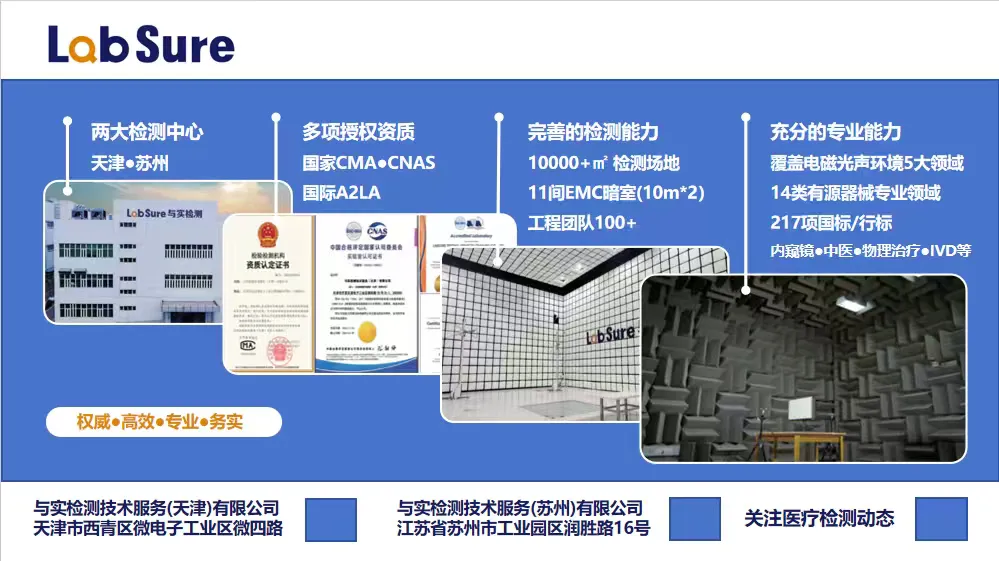 硬件实力雄厚,拥有超10000㎡检测场地、11间EMC暗室,超百人的专业工程团队,可承接各类复杂检测需求。服务能力全面,覆盖电、磁、光、声、环境5大领域,深耕内窥镜、中医、物理治疗、IVD等14类有源器械专业赛道,拥有217项国标/行标资质与能力,确保检测精准合规。