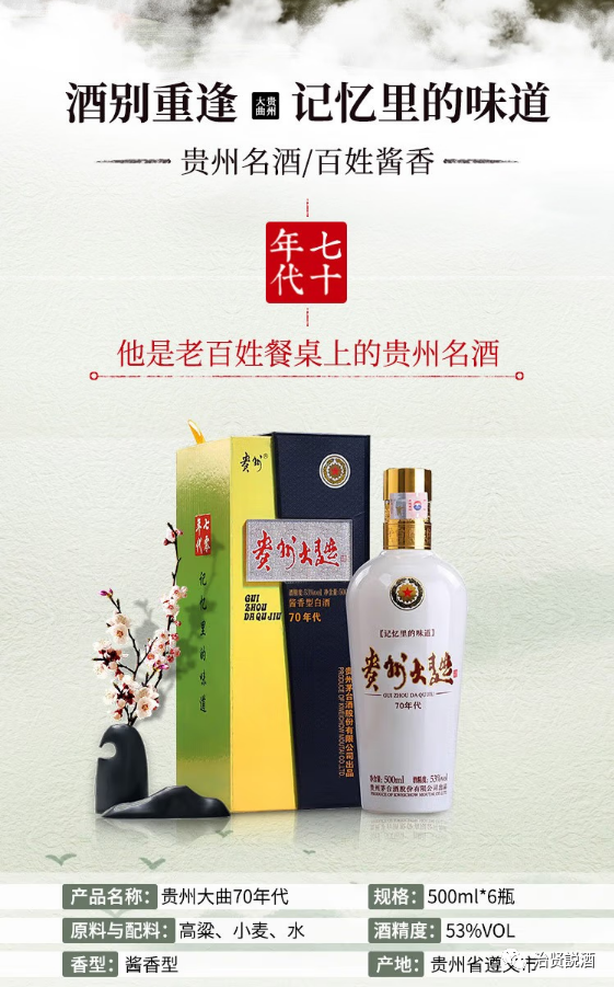 贵州大曲70年代整体来说味道还是挺不错的,开瓶闻香比较优雅,贵州大曲入口虽谈不上优雅柔顺但是不会感觉到刺激,香气虽正但是感觉不是很浓,回味略显苦味但是不会觉得重。和同级别王子赖茅对比下明显感觉柔顺很多但是酱味不够突出。