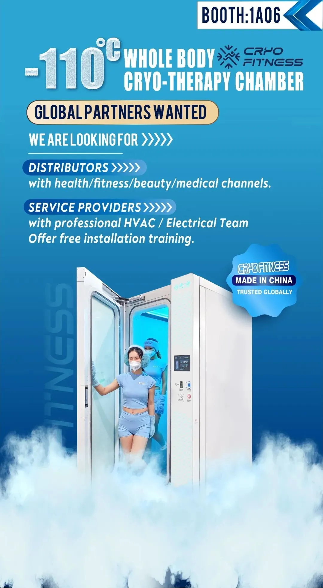 冻一动科技聚焦商用场景需求,现场将展示-110°C超低温冷疗舱核心产品,提供适配健身、康复、康养三大领域的一站式冷疗解决方案: