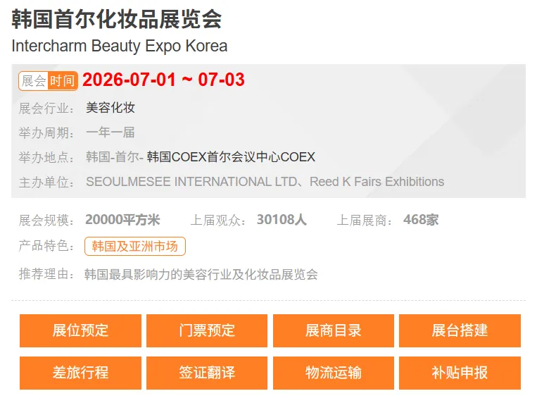 Intercharm Korea 2026 是中国美容企业进军亚洲市场的黄金跳板,其观众群体高决策力、高匹配度、广辐射范围的特征,为企业提供了高效的出海渠道。建议中国企业聚焦合规认证、产品创新、本地化服务三大核心,通过精准定位不同类型买家需求,制定差异化参展策略,在展会现场实现订单转化 + 品牌拓展 + 渠道布局的三重目标。