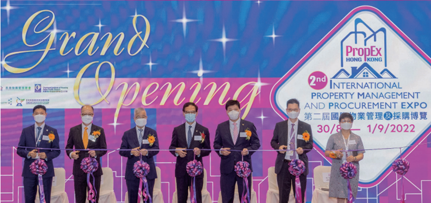 主礼嘉宾物业管理业监管局主席谢伟铨先生 (BBS, JP) (中) 及其他主礼嘉宾于展会开幕典礼进行剪彩仪式。