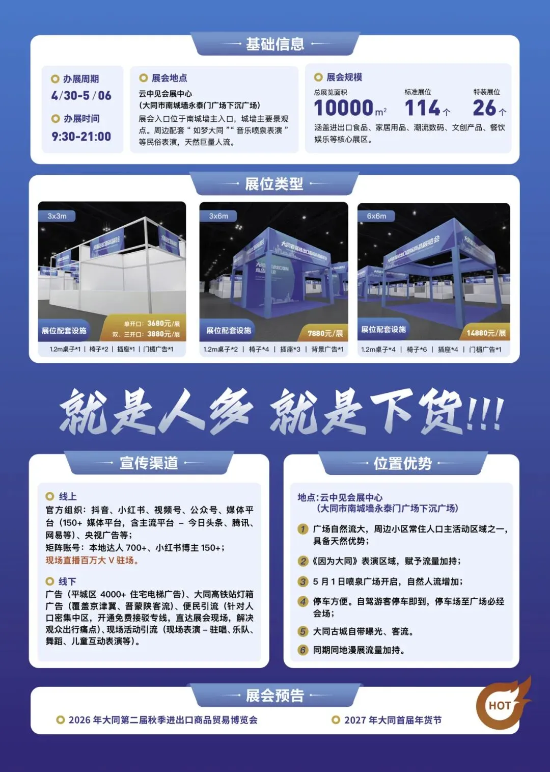 展会选址大同南城墙永泰门广场下沉广场,入口直面城墙主入口,周边“如梦大同”沉浸式演艺、音乐喷泉秀等文旅项目常年客流爆棚,日均数万游客+本地市民双流量加持,不愁没人逛!