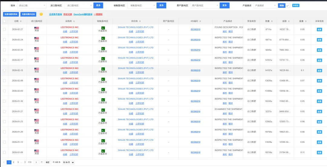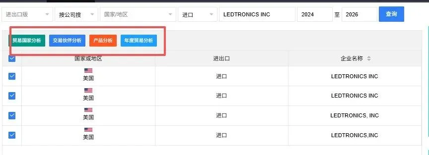 比如我在展会上收到了这个美国客户的名片和咨询,然后把客户公司名字LEDTRONICS INC放到海关数据里面去查询一下,确实是有采购的客户,没问题。